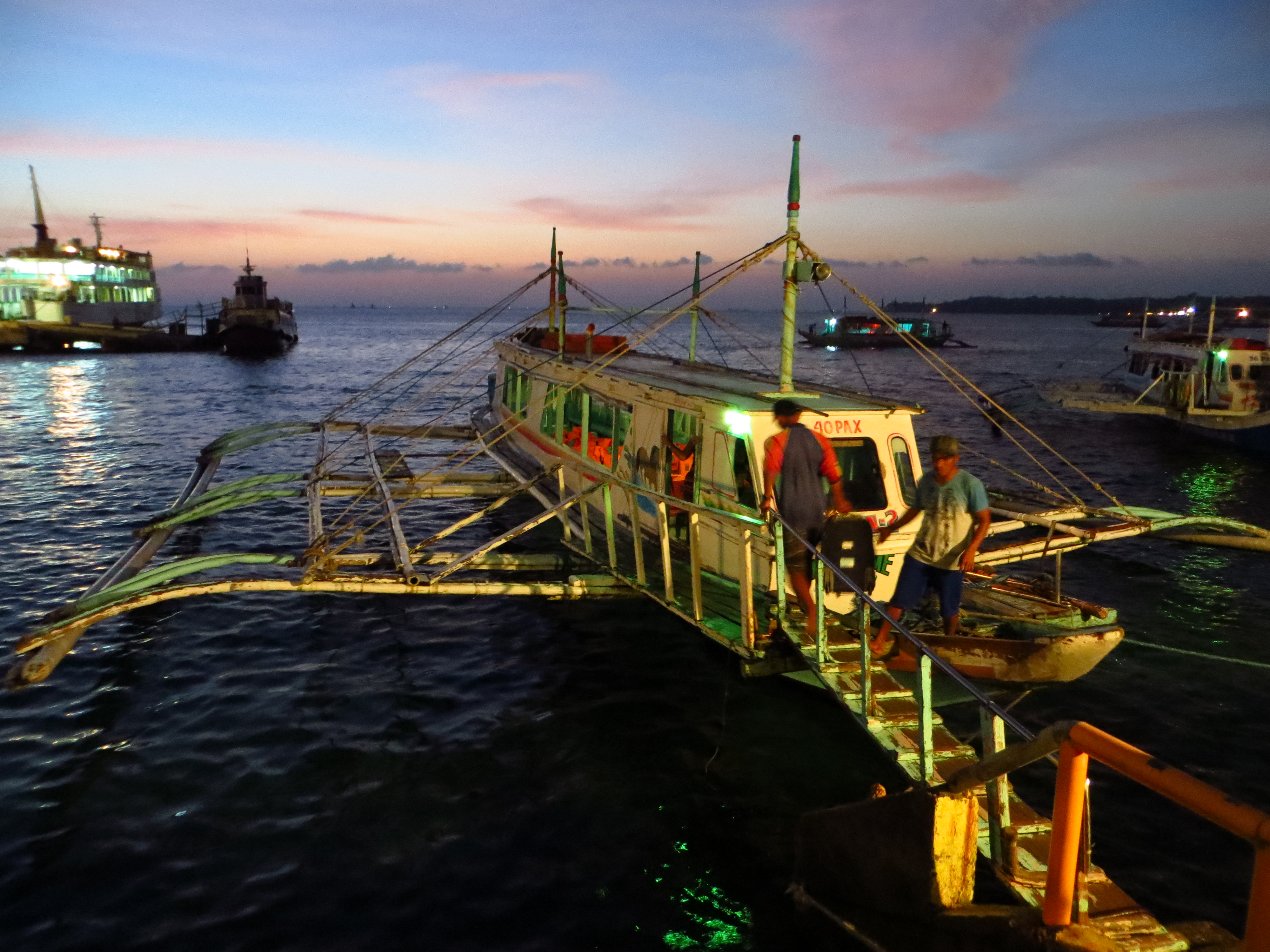 Aamusella meillä oli taas pakkausurakka. Oli vähän haikea tunne, kun tunsimme olevamme niin kotonamme Tepaneessa. Puolilta päivin luovutettiin huone, ja M rohmusi vielä yhden hieronnan ennen iltapäivän lähtöä. Kolmelta iltapäivällä veneemme odotti meitä rannassa, hyvästelimme ja halasimme Andrean, Silvian, Vittorion ja hauvat. Hyppäsimme kotirannalta veneeseen ja siellä sitten tuli M:lle sen verran surku, että piti suu mutrussa itkeä tirauttaa. Kamalaa näillä matkoilla on aina lähteä, varsinkin jos tutustuu ja tykästyy ihmisiin ja kotiutuu hyvin. Hetken päästä helpotti, olihan se komiaa aloittaa matka kotirannasta ja ajella yksityispaatilla Mayan puolelle. Matka kesti puolisen tuntia ja Mayassa hypättiin mustaan tyylikkääseen minibussiin. Ajomatka Mayasta Cebuun kesti kolmisen tuntia, ja ihailimme ohikiitäviä kyliä iltavalaistuksessa. Kyliä ja ihmisiä on koko ajan matkan varrella, näillä seuduilla elämä tapahtuu ulkosalla eikä sisällä kuten meillä.