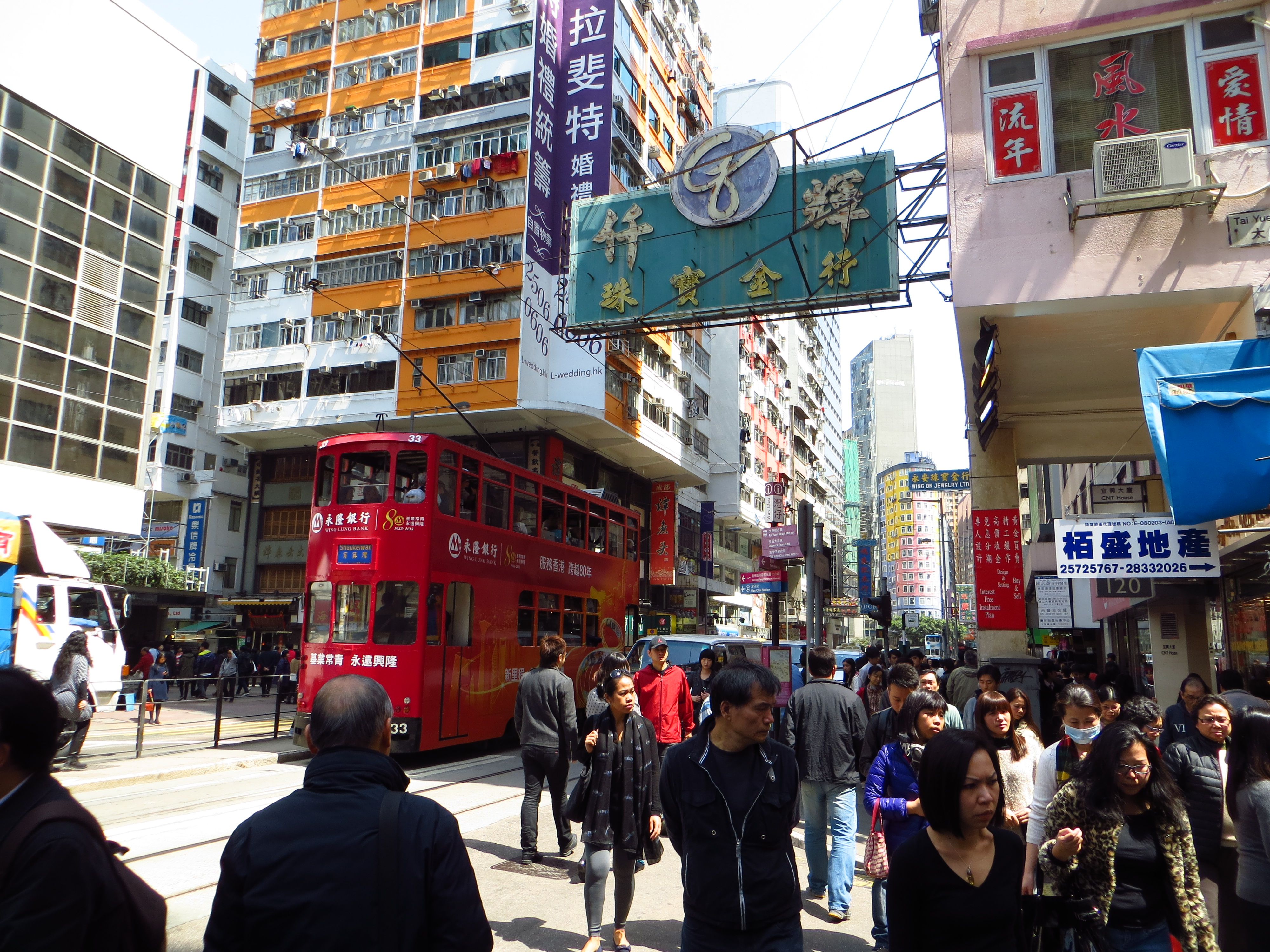 Hong Kong Islandin puolella liikennöivät myös hauskat kaksikerroksiset raitiovaunut. Reittiverkosto on helppo ja ratikkalippu maksaa 23 senttiä. Vaunuun mennään sisään takaovesta ja ulos etuovesta, ja maksetaan lähtiessä pudottamalla riittävä määrä kolikoita lippaaseen. Myös busseja on paljon ja verkostot kattavat. Liikkumisen infra on ihailtavan tehokasta, helppoa ja selkeää. Helsingissä eksyy helpommin.