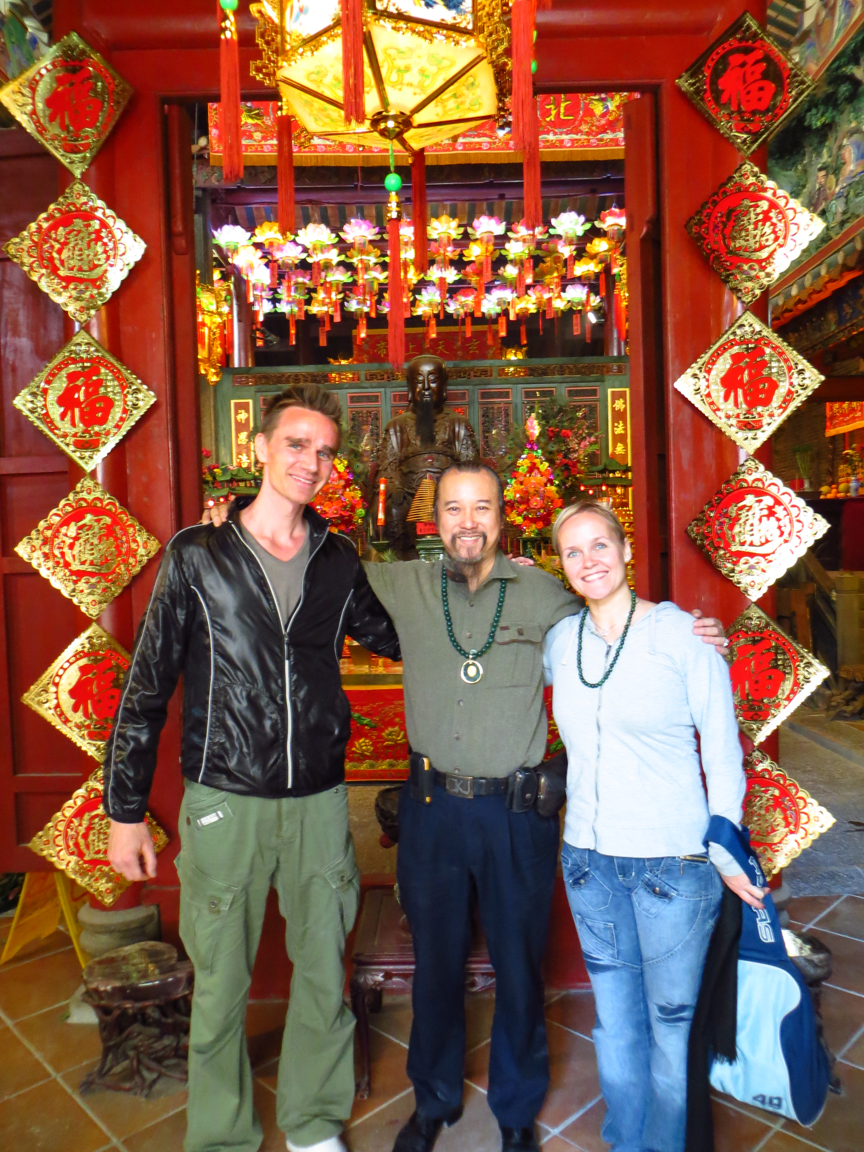 Tapasimme myös temppeliä vetävän tutun herran, jonka tapasimme viimeksikin. Kovasti koitettiin jutella taas niitä näitä vaikka hieman kielimuuria oli. Kun kerroimme olevamme häämatkalla, hän halusi antaa meille lahjan, L sai hienon lohikäärmeamuletin ja minulle hän ojensi kauniit vihreät jadehelmet. Halusimme antaa jotakin vastalahjaksi mutta hän kieltäytyi visusti. Kiitimme kauniisti, kiertelimme vielä temppelissä ja nautimme tunnelmasta. Jep, lumo oli tallella. Jos ja kun vielä HK:n tullaan, on temppeli aina vierailulistalla. Tunnustettava on, että meillä ei ole mitään hajua, mitä uskontoa temppelissä harjoitetaan, mutta tarinat ja legendat ovat kiehtovia.